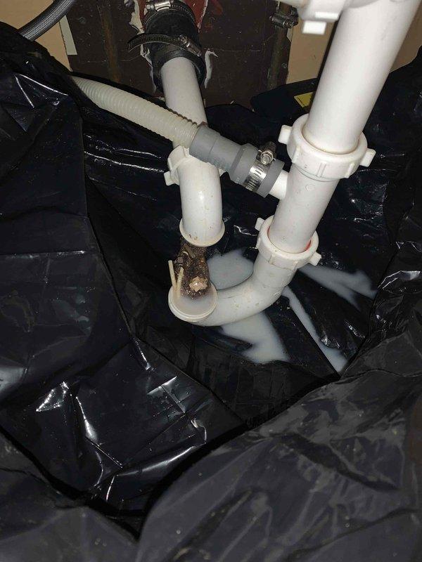 Responded to service call for kitchen sink drainage issues and leaking from beneath fixture. Upon inspection, discovered partial clog in the P-trap with visible debris accumulation causing restricted flow. Disassembled drain assembly, cleaned P-trap and drain pipes, and resealed connections with new gaskets to eliminate the leak. Verified proper drainage function before completing service.
