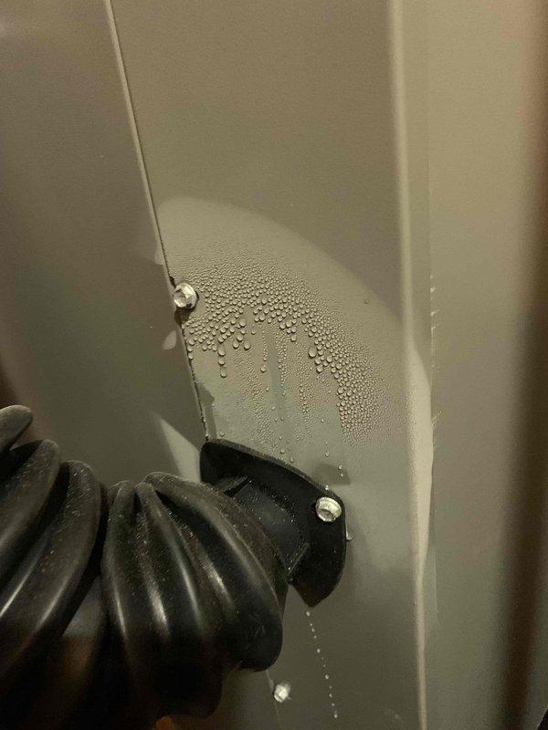 Responded to warranty callback for recently installed Lennox air conditioning unit not cooling properly. Upon inspection, discovered excessive condensation accumulation on interior cabinet surfaces, indicating potential airflow restriction or refrigerant charge issue affecting system performance. Documented conditions with photos showing water droplet formation and moisture patterns throughout unit interior, then performed diagnostic testing and corrective measures to restore proper cooling operation.
