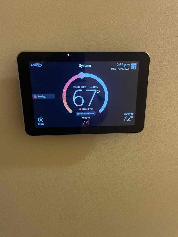 Responded to no heat call for 13-year-old furnace system in basement with blank thermostat display. Upon arrival, diagnosed thermostat power issue and restored functionality to Lennox digital thermostat, which now displays proper temperature readings and system controls. Verified heating system operation and confirmed thermostat communicating correctly with furnace equipment.