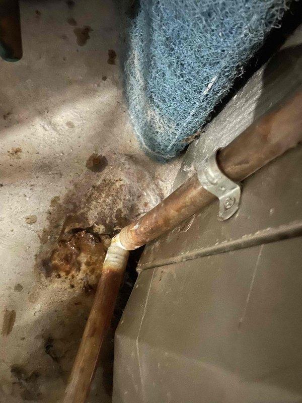 Responded to reported leak under furnace in basement. Upon inspection, identified significant corrosion and rust at copper pipe connection point with visible oxidation and deteriorating insulation wrap. Documented corroded plumbing components showing heavy rust formation at joint connections, along with aging insulation material and equipment wear consistent with unit over 10 years old.