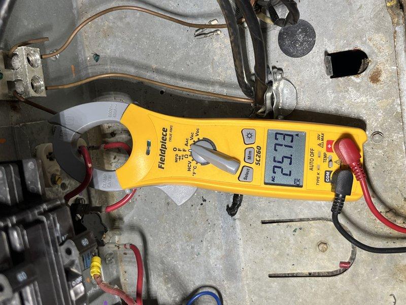 Responded to callback for heating system still blowing cold air after sequencer replacement. Upon arrival, performed electrical diagnostics using digital multimeter to verify amp draw and voltage readings across heating elements and sequencer circuits. Measurement of 25.72 displayed on meter during testing indicated potential issue with heating element operation or sequencer staging. Inspected all electrical connections, terminal blocks, and wiring associated with electric heat strips to identify root cause of continued cold air complaint and determine if additional repairs beyond initial sequencer replacement were necessary.