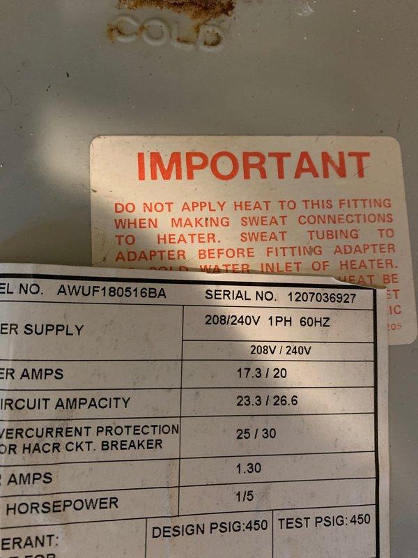 Responded to no cooling complaint on residential split system located on back patio. Upon arrival, found Goodman air handler model AWUF180516BA (over 10 years old) with system blowing warm air. Performed diagnostic evaluation and documented equipment nameplate specifications for service records.